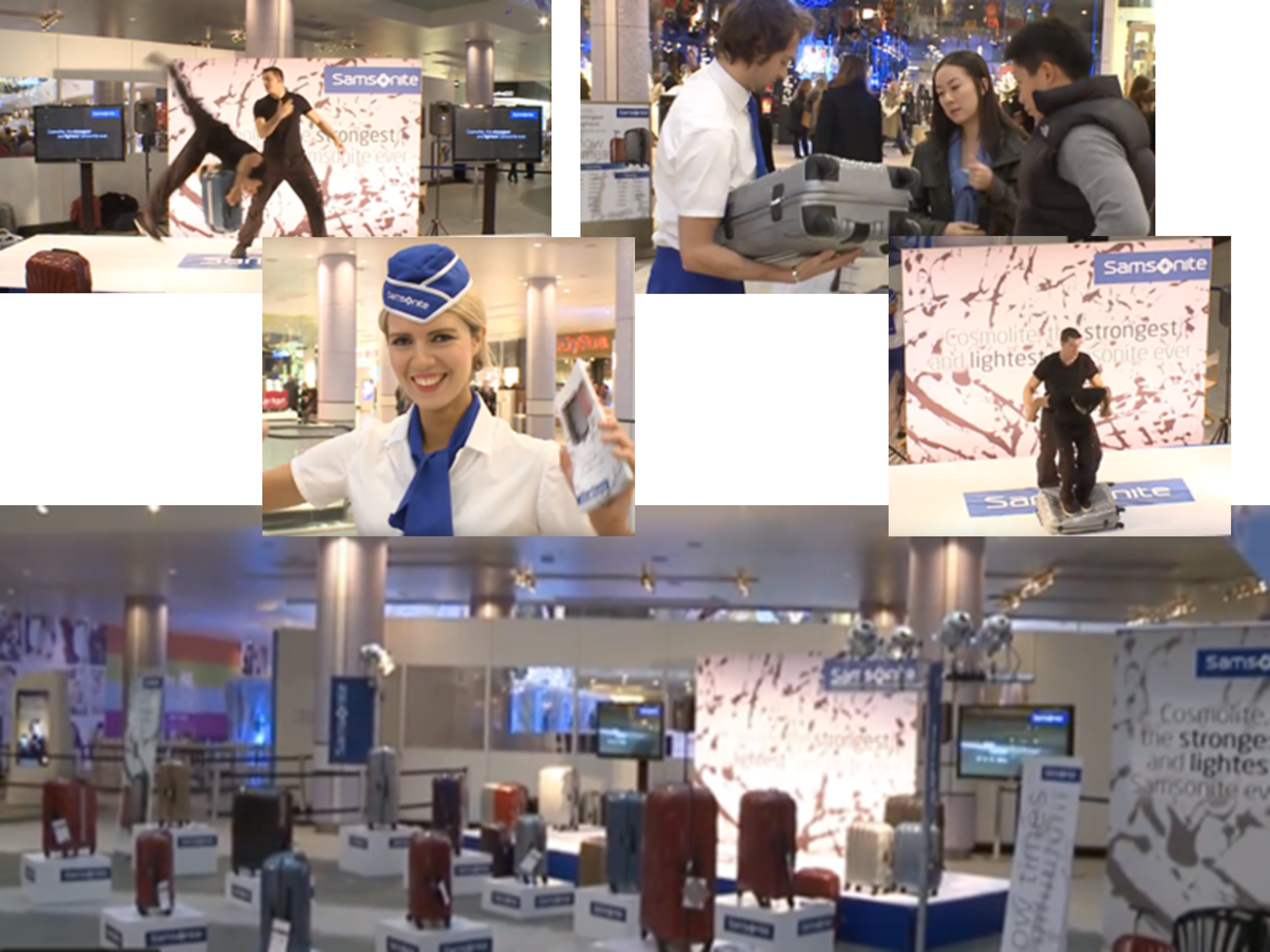 Tactics: UK wide shopping centre roadshow (14+ locations, Fri - Sun events). Acrobats performed hourly shows with the suitcases demonstrating lightness and flexibility in consumer friendly way , accompanied by product demo area, product special offers and flight crew demonstrators. Local stores also aligned with activity with in-store hot spots etc.