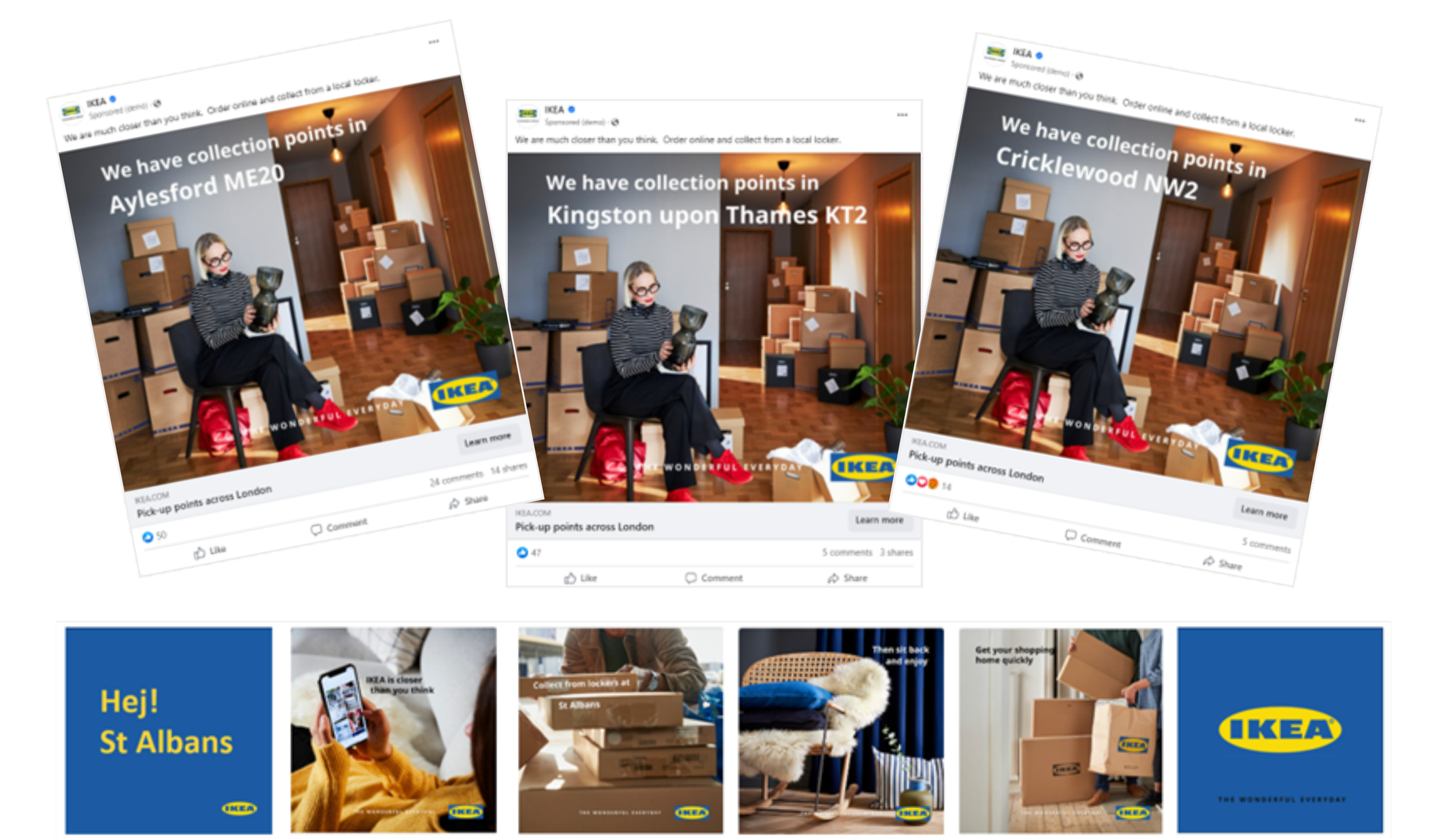 Tactics: Created a geo-targeted strategy, assets and media plan built on a series of bespoke adverts served across Facebook and Instagram highlighting how close an IKEA locker was to the viewer (within 4km) or same day local store click and collect service (within 10km).